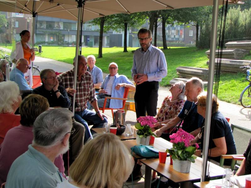 Twee dagen later volgde het bezoek van Thijs Reuten, die in het Dagelijks Bestuur van Stadsdeel Oost zit, met o.a. bouwen, wonen en sport in zijn portefeuille. Voorheen was hij wethouder in Oost. Hij kreeg een aantal kritische vragen voorgelegd, over o.a. de toekomst van de Kop van het Java-eiland, maar ook over andere onderwerpen. Het was interessant, om met hem van gedachten te wisselen en in voorjaar 2015 komt hij zeker nog eens terug. Tevens waren die dag vier vertegenwoordigers van de Ouderen Adviesraad van Stadsdeel Oost aanwezig , waarbij voorzitter Frank Stork het woord voerde en de aanwezigen informatie over de Adviesraad verschafte.